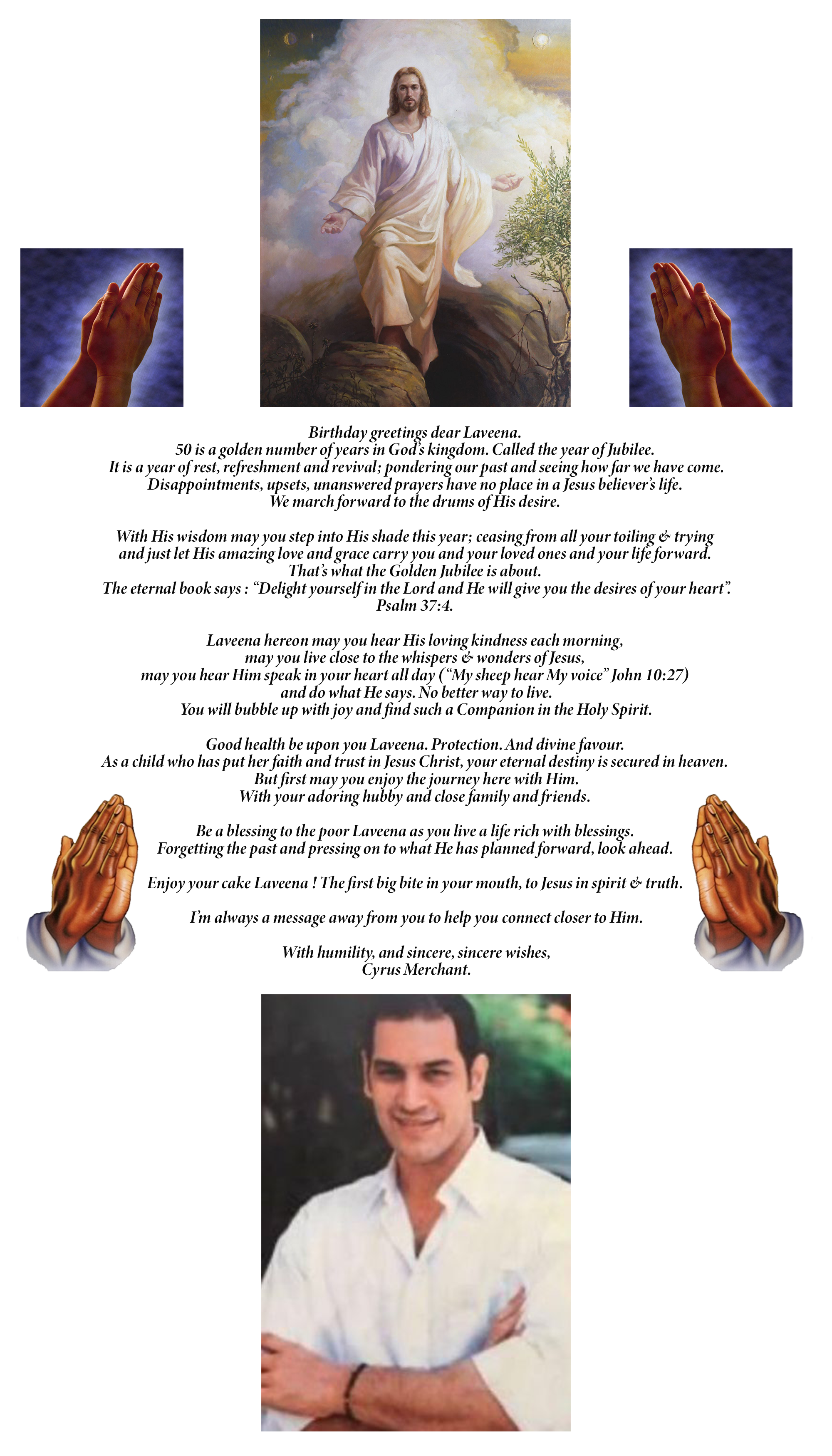 Lavi darling, happy 50th birthday my dear child. On this very special day, it is my sincere prayer from heaven, directly to God and his angels (who I now know very well by the way) that you my beautiful granddaughter are blessed with a long, healthy and happy life with Sajjid by your side. May God grant you your every wish and may the kindness and generosity you have in your warm and caring heart, touch and make a positive difference to infinite lives. Amen.